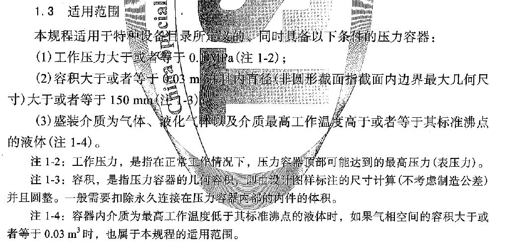 (二)压力容器,是指盛装气体或者液体,承载一定压力的密闭设备,其范围规定为最高工作压力大于或者等于0.1MPa(表压),且压力与容积的乘积大于或者等于2.5MPa·L的气体、液化气体和最高工作温度高于或者等于标准沸点的液体的固定式容器和移动式容器;盛装公称工作压力大于或者等于0.2MPa(表压),且压力与容积的乘积大于或者等于1.0MPa·L的气体、液化气体和标准沸点等于或者低于60℃液体的气瓶;氧舱等。