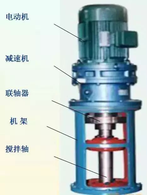 反应釜需要电动机和传动装置来驱动,搅拌器传动装置一般安放在釜体的顶部,通常采用立式布置,如图所示。电动机的转速较高,通过减速机可将转速降至工艺要求的搅拌转速,再通过联轴器带动搅拌轴转动。