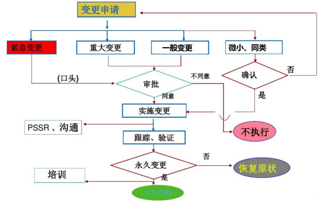 企业在工艺、设备、管理、环境等发生永久性或临时性的变化时,可能会产生新的风险。按照风险管理的流程,对风险进行辨识、制定控制措施、验证控制措施的有效性、加强员工培训等过程,就是变更管理的全过程。