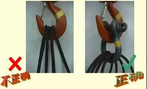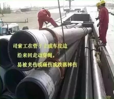 人员站在存在被挤压风险的狭小空间 02 人员站在吊物下方 03 挂吊工站在松散的管料上及车皮临边 吊带使用不当 01 四根吊带一个钩 02 吊带打结使用 03 吊带扭转 04 吊带钩挂不到位 05 使用被割裂、散边的吊带 钢丝绳使用不规范 01 棱边、快口的情况下未垫护 02 使用扭曲、变形的钢丝绳 03 使用麻芯外露的钢丝绳 未使用卸扣或卸扣使用不正确 01 多根钢丝绳起吊,未使用卸扣 02 将钢丝绳挂在卸扣横销一侧 03 采用回绕、穿挂等方式代替卸扣