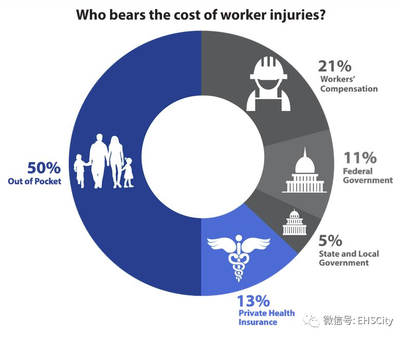 理论上,发生工伤事故后,雇主应该为受伤职工提供的赔偿保障包括损失的工资、医疗费用、以及复工费用。然而实际操作中,雇主支付的赔偿和补助非常有限。学术界在新墨西哥州的一项调查显示:近10年来,享受工伤事故赔偿的受伤职工,仅收到不到原工资15%的补助;而那些没能加入工伤赔偿系统的受伤职工的损失就更大了。像罗伯特这样的低收入家庭,却在应对事故的各种开支中承担了较高份额。当前美国社会各界在一起工伤事故中担负资金的比例如下:其中,联邦政府一般担负11%,州和地方政府担负5%,职工赔偿基金占21%,私营卫生保险机构支付13%,而剩余50%则由受伤职工及其家庭承担。