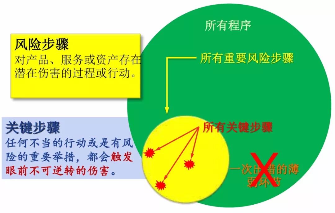 在这些风险步骤中,有一些是关键步骤。关键步骤是指任何不当的行动或是有风险的重要举措,都会触发立即发生的不可逆转的严重伤害。关键步骤主要出现的情形和表现为:任何无法挽回的节点;触动能源、信息、物质的转移的步骤;常发生于与潜在的高能量设备打交道;对昂贵的或稀缺资源的运作过程;工作职责(权利)的交换;在作业设备(设施)的操作中,一个步骤或误操作会打破一个系统的流程,造成危险因素间的相互作用,并引起严重的后果等。这些关键步骤,就是我们进行安全防御的重点。一次出错的薄弱环节发生在关键步骤上,是非常危险的,需要我们加以重点保护,并设置多重防御。如不但要提醒,还要进行确认、报警等。