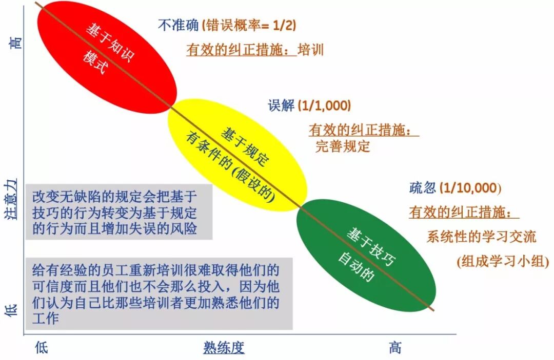 按照员工的学习特点,可以将其分为三类:基于知识的模式、基于规定的模式、基于技巧的模式。第一种模式错误概率是最高的,大1/2,如图13的红色区域所示;第二种模式的错误概率是千分之一,如图13的黄色区域所示;第三种模式的错误概率是万分之一,如图13的绿色区域所示,这类人导致的一般都是大事故。