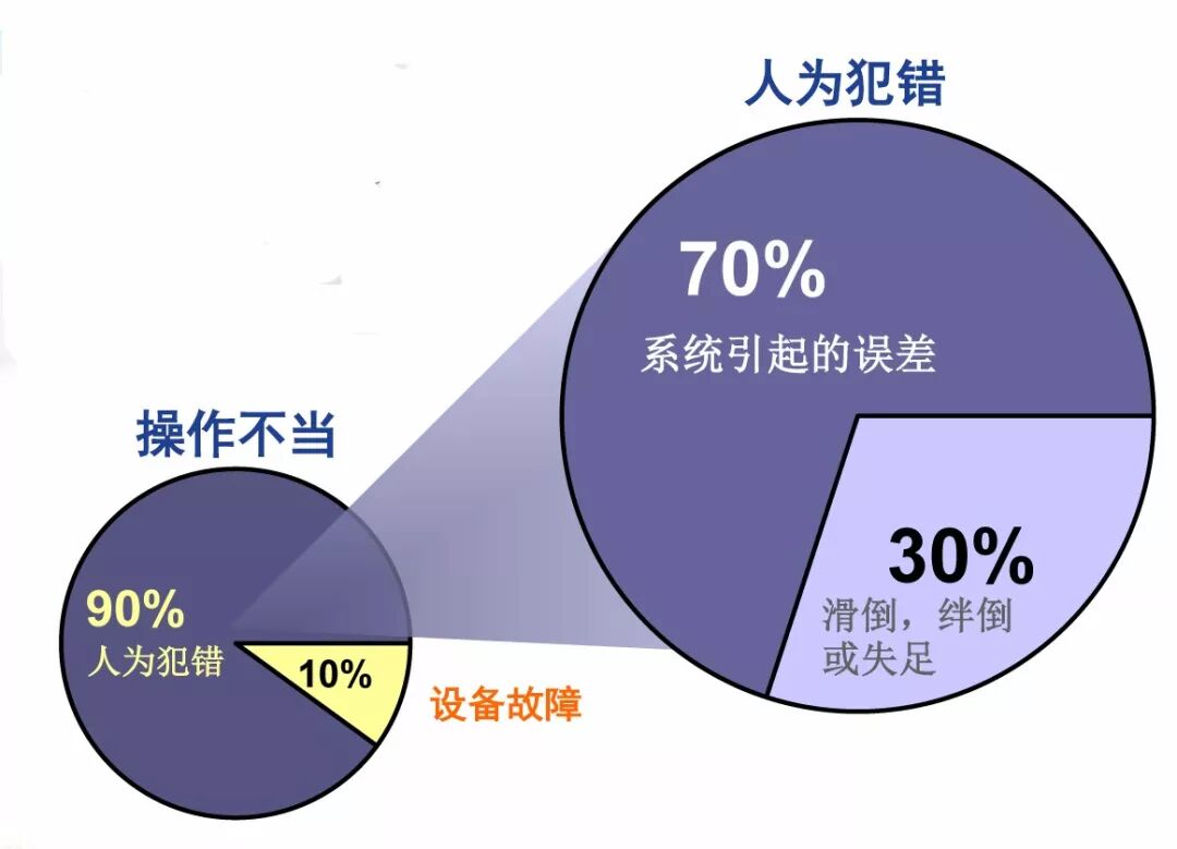 人为错误的根源在哪里呢?在操作不当方面,90%是由人为犯错造成,10%是由设备故障造成。而在其中90%的人为犯错里面,70%是由系统引起的误差所致,30%则是由于滑倒、绊倒或失足所致。