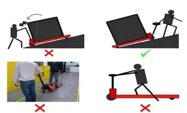 严禁在倾斜的斜面或陡坡上操作手动液压叉车,若须手动液压叉车在斜坡上使用时,操作者不得站在坡下方,避免手动液压叉车惯性导致速度过快失控而发生危险;