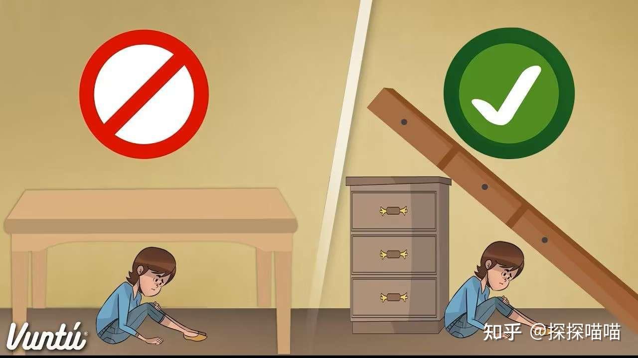 - 次选结实的桌子、床旁(注意:不是钻下面,而是紧贴侧面,形成“生存三角”)。