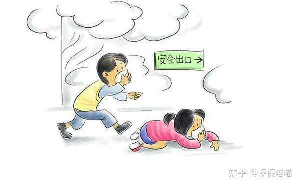 - 湿毛巾捂口鼻,弯腰低姿撤离!
